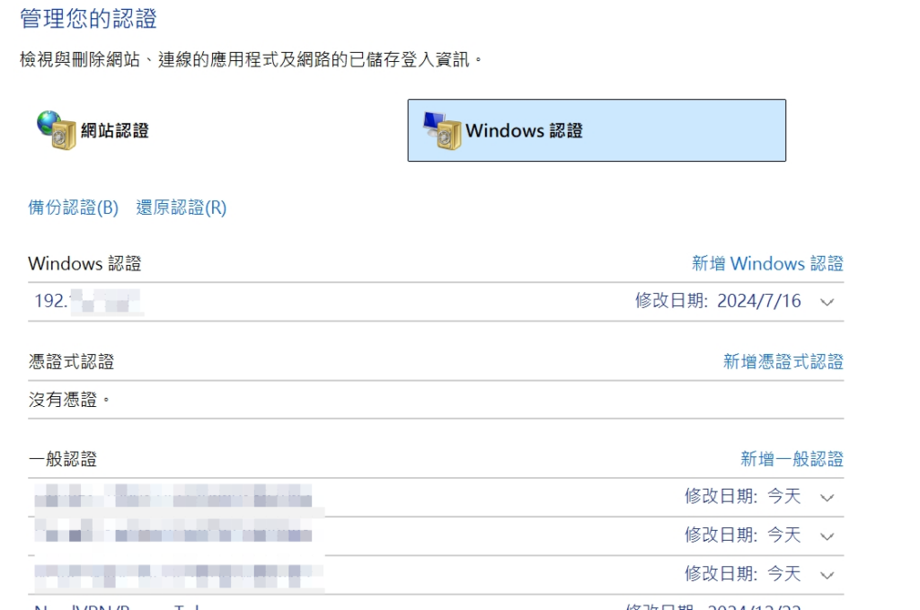 除了網路磁碟機連線,有時需要刪除記憶的帳號認證。以下是兩種方式來管理這些認證。